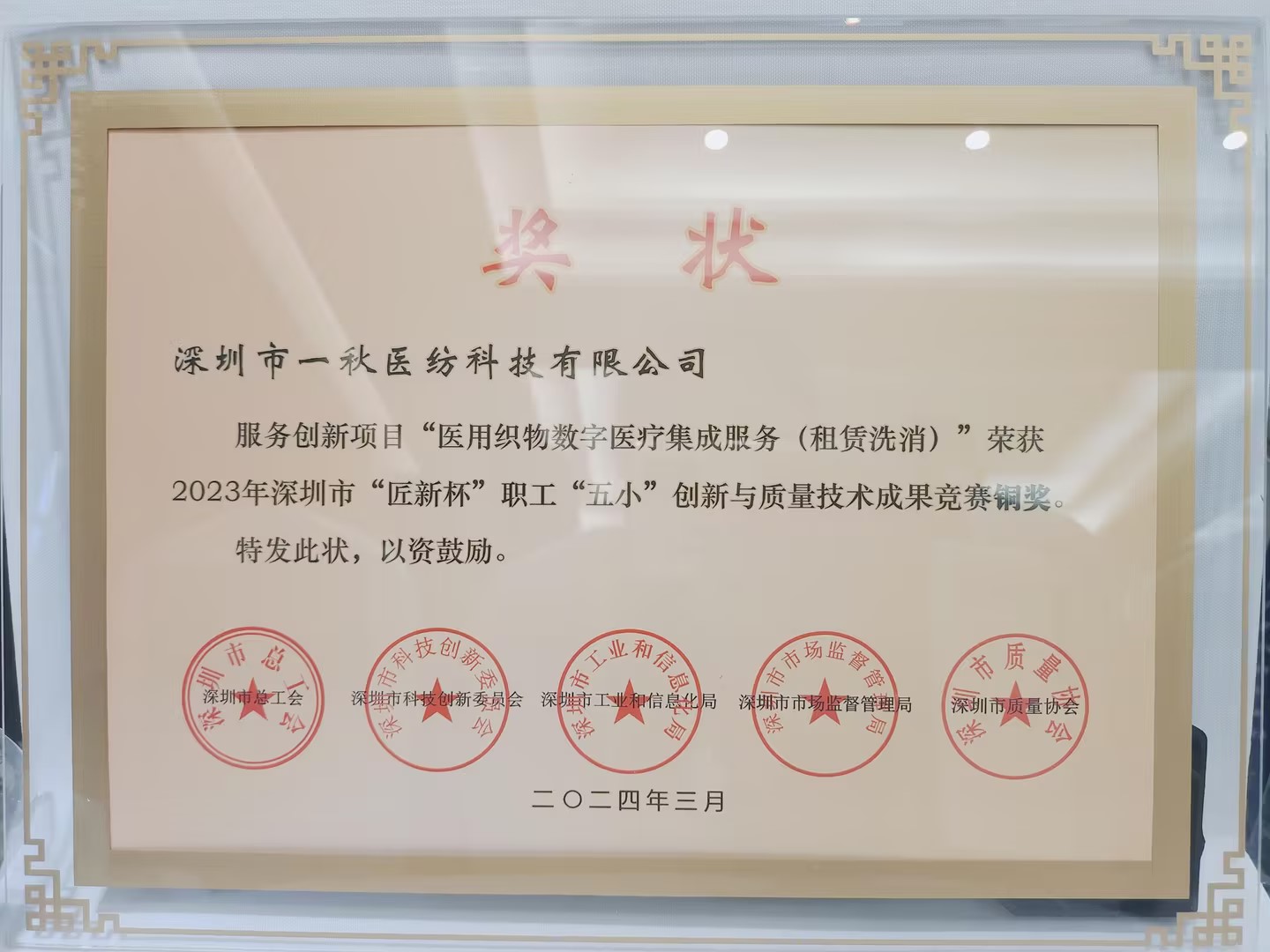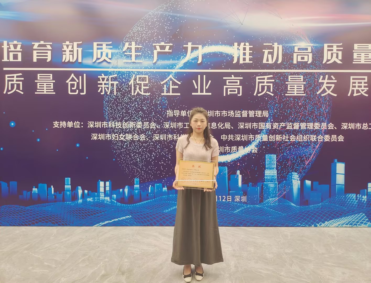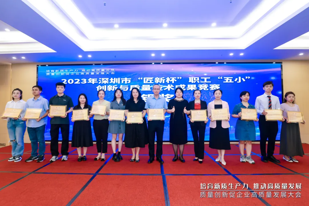 2024年4月12日在鹏润达商业广场西座11楼ECO国际会议中心海岚厅举办“深圳质量创新促企业高质量发展大会”,此次会议由深圳市总工会、深圳市科技创新委员会、深圳市工业和信息化局、深圳市市场监督管理局联合深圳市质量协会为2023年深圳市“匠新杯”职工“五小”创新与质量技术成果竞赛中获奖的全市广大杰出职工及优秀项目颁奖,彰显深圳市在创新与质量方面的引领地位,旨在搭建职工技术创新和质量提升的专业交流平台,促进职工技能提升,推动行业创新发展。
