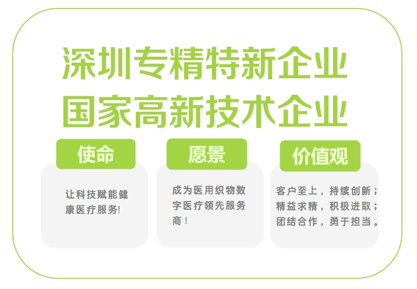 十年深耕,铸就行业领军地位。以国家级高新技术企业之姿,携“专精特新”之锐,正式进入深圳前海股权交易中心“专精特新专板”(代码:990224)! 标志着公司在技术创新、市场拓展、品牌影响力等方面取得了阶段性的成就,并获得了资本市场的广泛认可。未来,我们将借助资本市场的力量,进一步推动公司业务的全球化布局,持续提升产品研发能力,优化服务体系,为全球客户提供更优质的医用织物智能一体化解决方案。